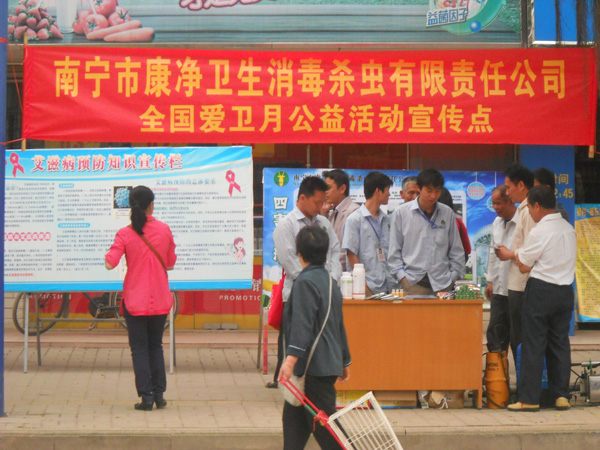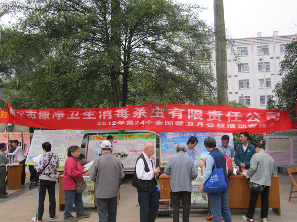2012年4月6日在南寧市興寧區(qū)政府以及愛衛(wèi)辦的組織下,康凈公司兩個組分別在南寧市人民公園和科園西十路,開展2012年第24個全國愛衛(wèi)月公益活動,圖為愛衛(wèi)辦領(lǐng)導小組到科園西十路活動現(xiàn)場指導,以及康凈公司專業(yè)技術(shù)人員在人民公園為廣大市民講解四害相關(guān)知識。